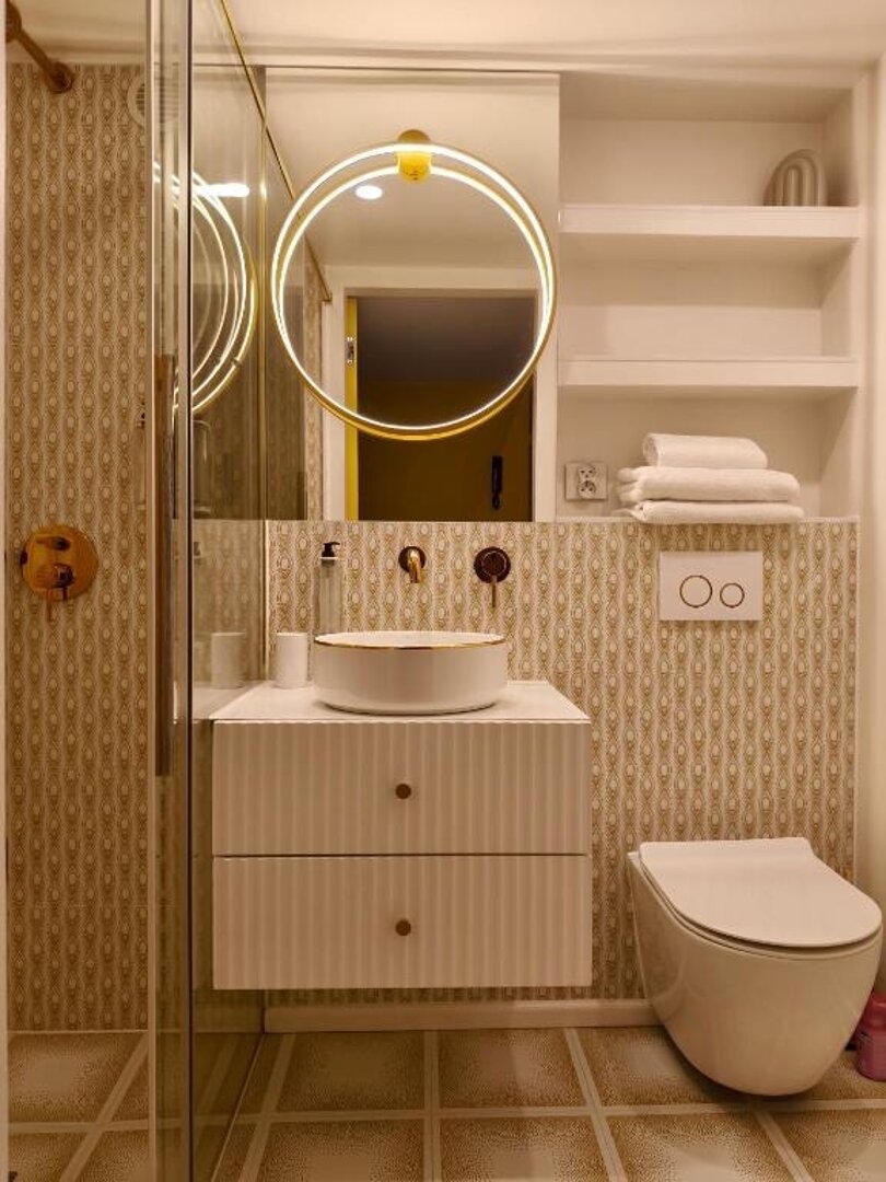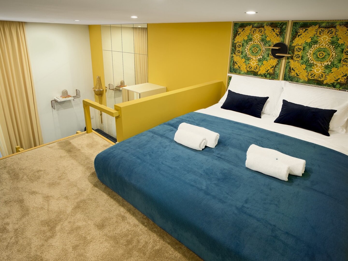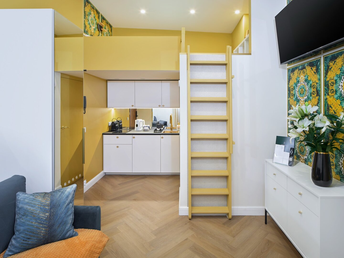 BOOGIE Home Papillon 15 Studio to komfortowe, dwupoziomowe studio o powierzchni odpowiedniej dla 1–4 osób, idealne np. dla pary z dziećmi. Charakter wnętrza podkreślają słoneczne kolory oraz wyrazista tapeta inspirowana projektami Versace. Złote elementy w łazience, lampach i meblach dopełniają elegancki wystrój.