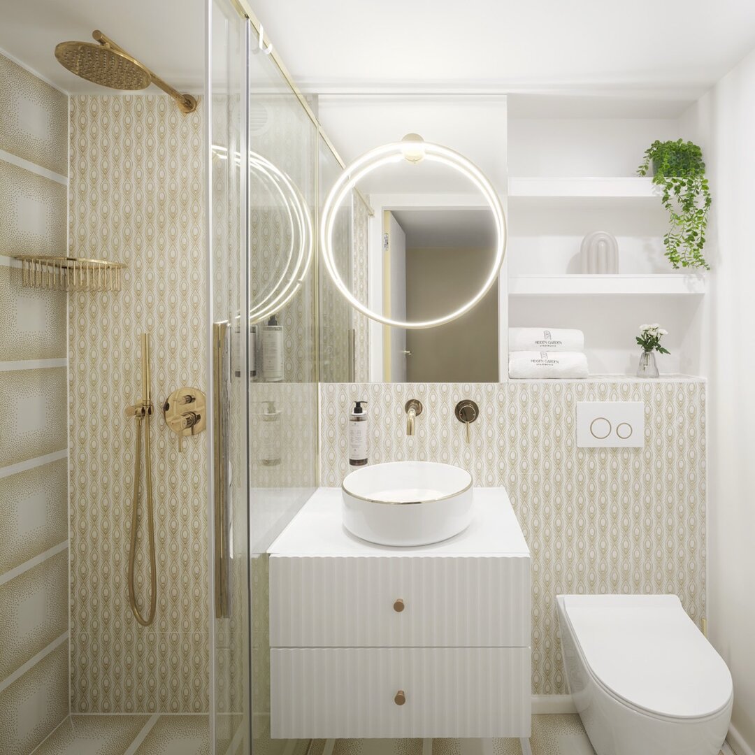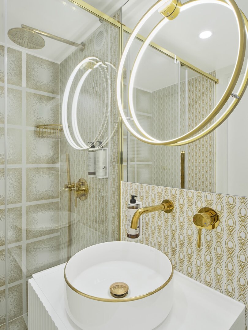 Łazienka w kolorach bieli i złota wyposażona jest w kabinę prysznicową z deszczownicą. Dodatkowy komfort zapewnia szeroki, pokryty pianką parapet – idealny na chwilę relaksu przy herbacie lub kawie. Intymność gwarantują regulowane plisy oraz długie, kremowe zasłony, które umożliwiają całkowite odizolowanie się od świata zewnętrznego.