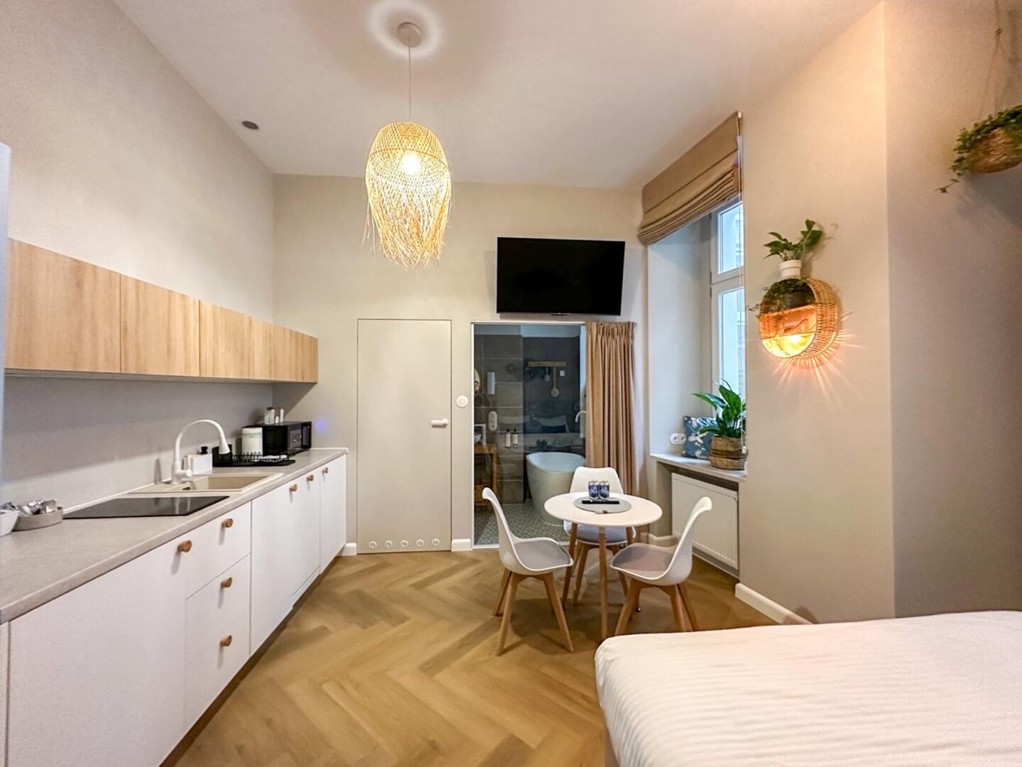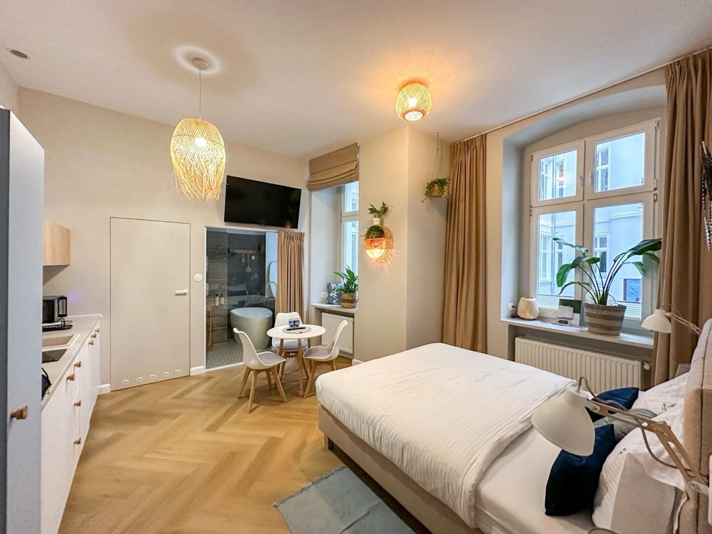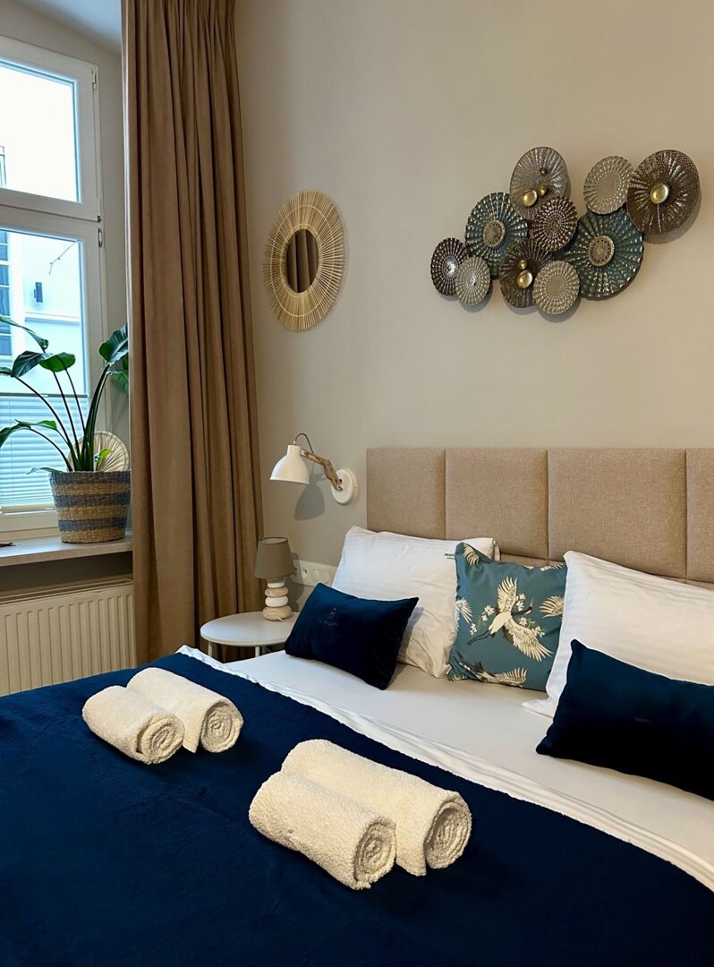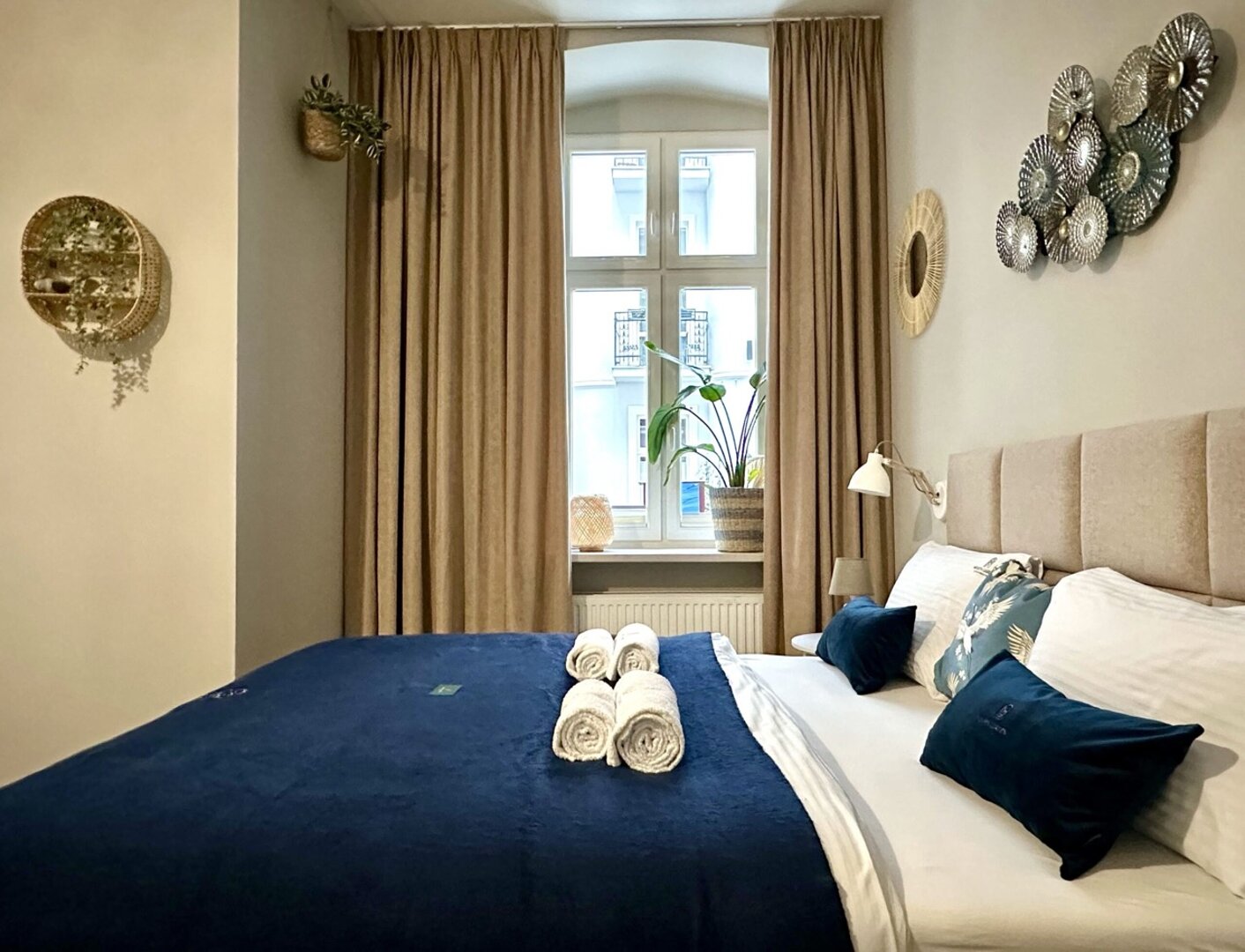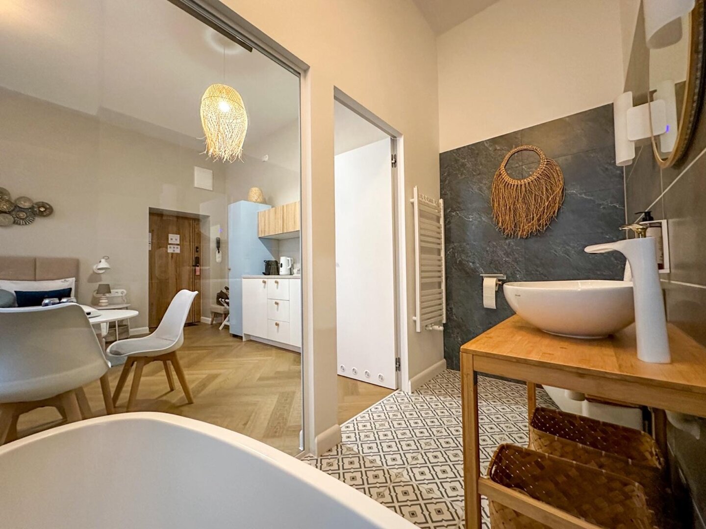 Główną atrakcją apartamentu jest wolnostojąca wanna widoczna z pokoju przez przeszkloną ściankę łazienki. Komfortowe łóżko kontynentalne z miękkim zagłówkiem oraz pastelowy wystrój sprzyjają odpoczynkowi po intensywnym dniu. W aranżacji wnętrza zastosowano naturalne materiały charakterystyczne dla stylu boho – bambus, rattan, juta i hiacynt wodny, widoczne w meblach i lampach.