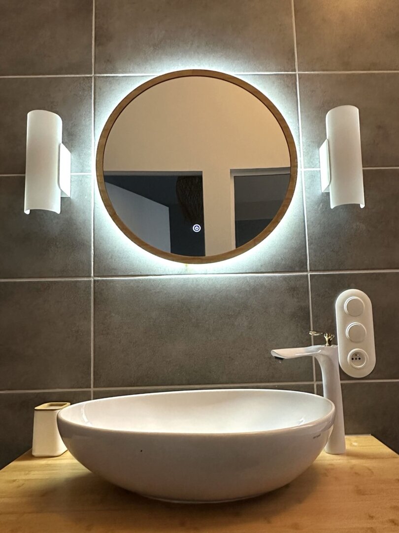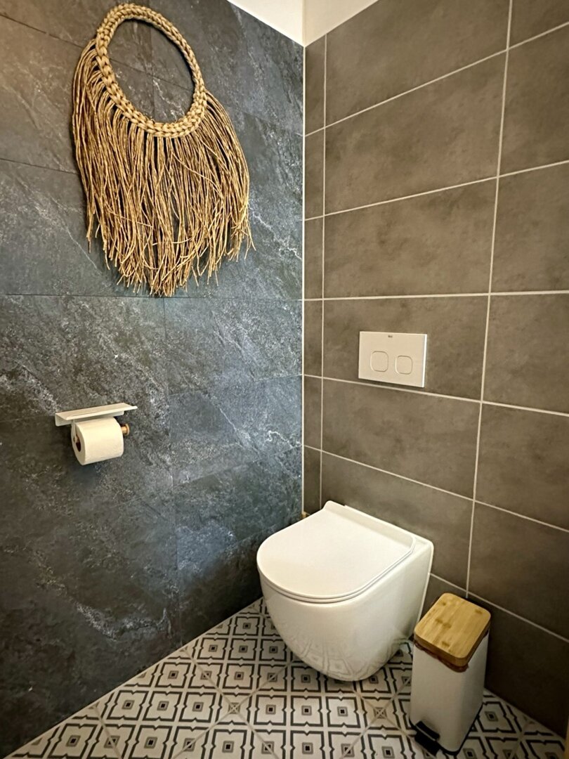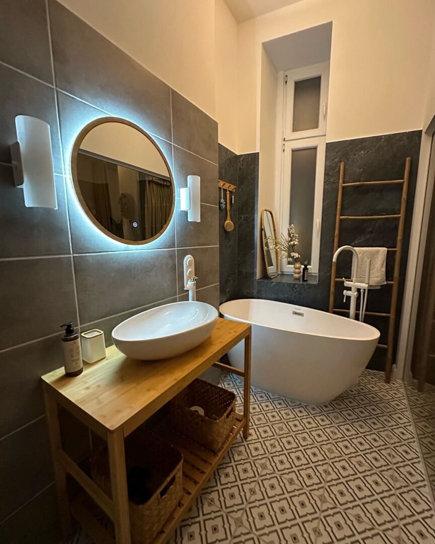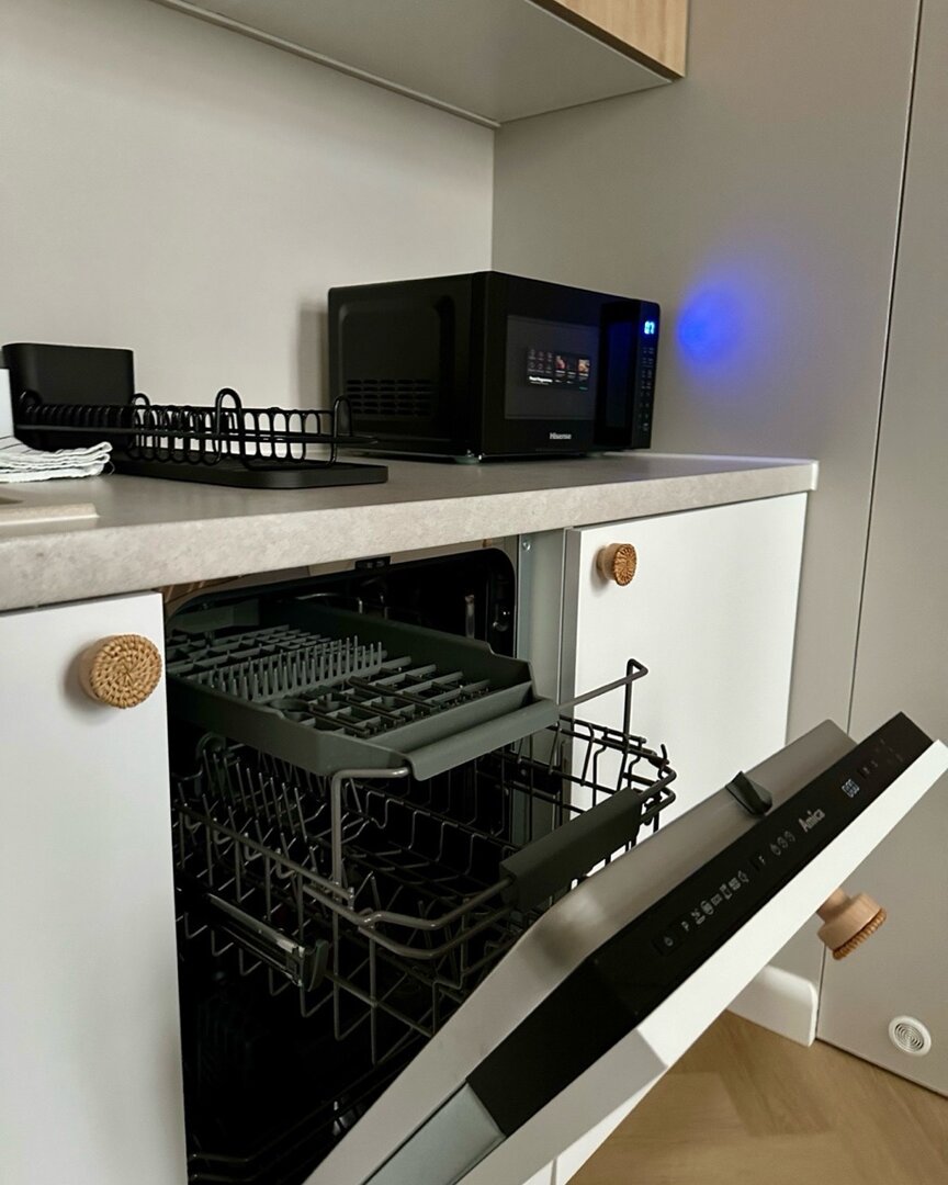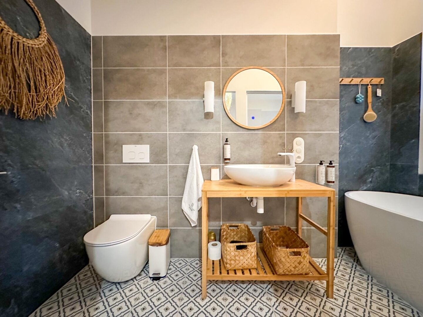 Główną atrakcją apartamentu jest wolnostojąca wanna widoczna z pokoju przez przeszkloną ściankę łazienki. Komfortowe łóżko kontynentalne z miękkim zagłówkiem oraz pastelowy wystrój sprzyjają odpoczynkowi po intensywnym dniu. W aranżacji wnętrza zastosowano naturalne materiały charakterystyczne dla stylu boho – bambus, rattan, juta i hiacynt wodny, widoczne w meblach i lampach.