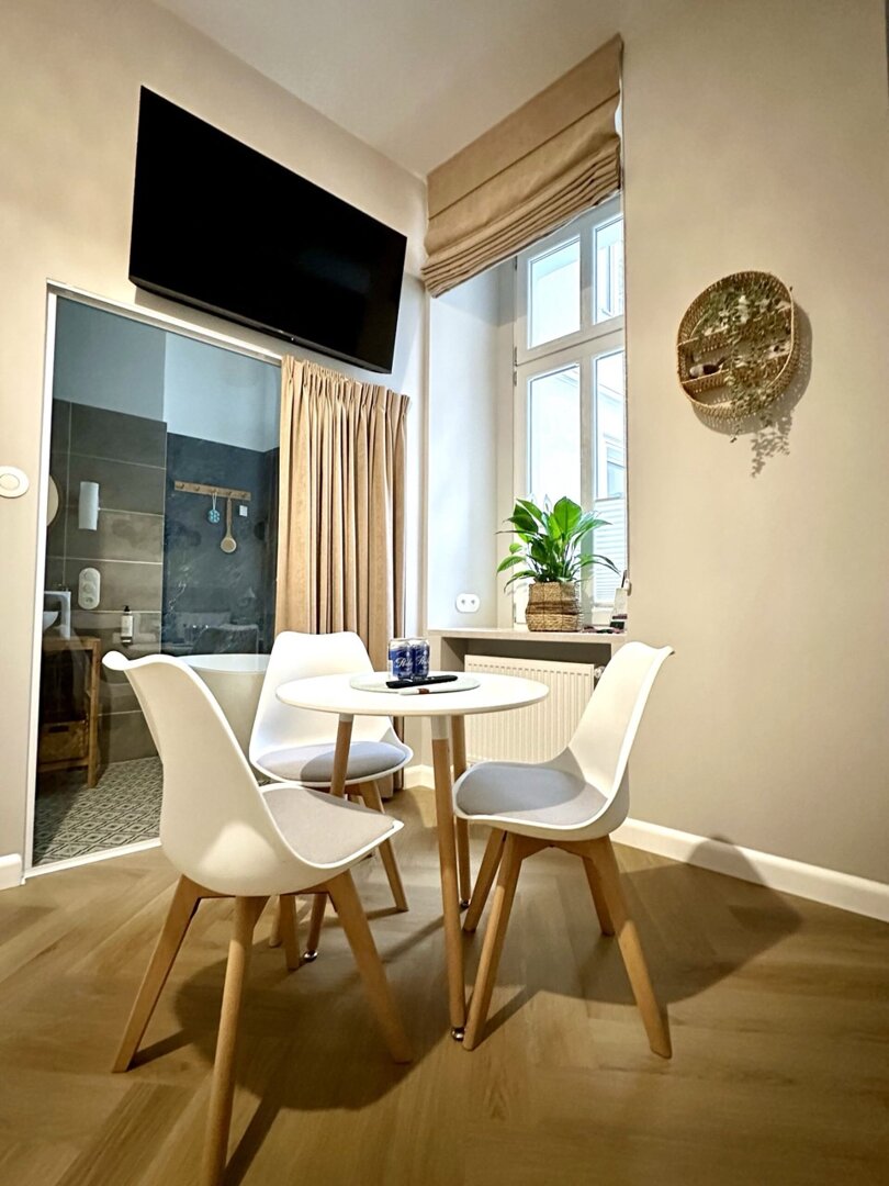 Apartament posiada w pełni wyposażony aneks kuchenny, a posiłki można spożywać przy okrągłym stole z wygodnymi krzesłami. Okna wychodzące na zadbany ogród i podświetlany słupek z witrażami barwnych motyli można zasłonić regulowanymi plisami materiałowymi, a grube ściany z cegły i długie, miękkie zasłony dodatkowo zapewniają intymność i komfort pobytu.