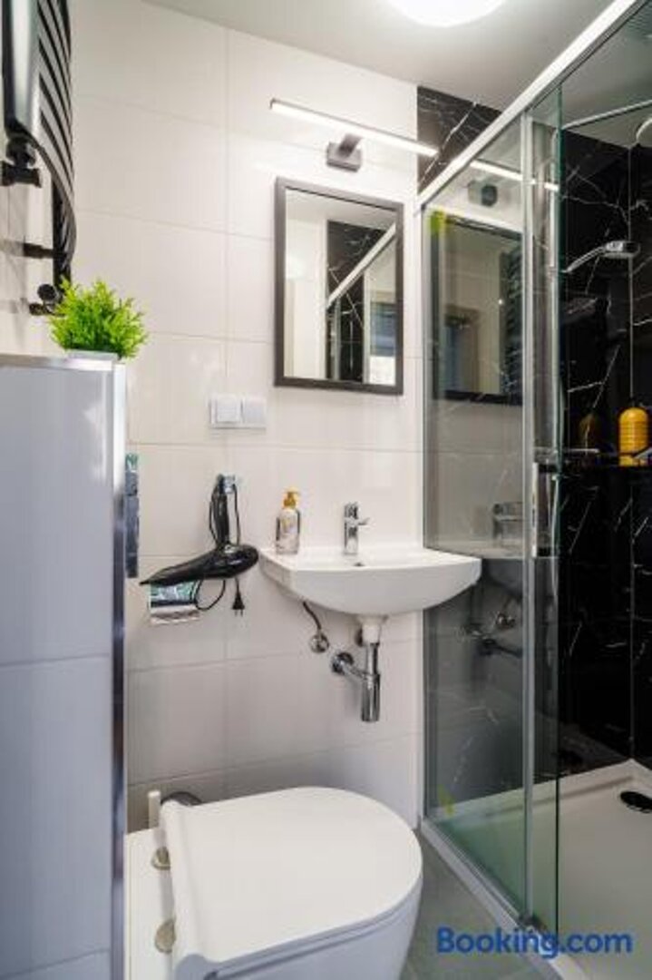 BOOGIE Home Papillon 16 to loftowy apartament dla 1–2 osób o powierzchni 24 m². Wystrój w kolorach czerni, butelkowej zieleni i kortenu, z neonem nad łóżkiem i przeszklonym prysznicem. Komfortowe łóżko kontynentalne, w pełni wyposażona kuchnia i elegancka