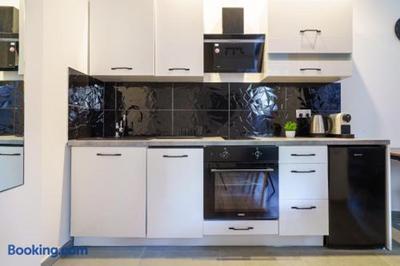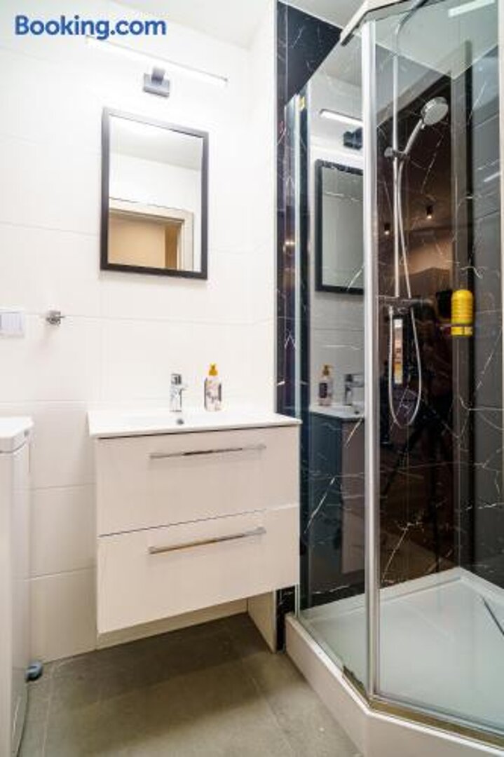 BOOGIE Home Papillon 16 to loftowy apartament dla 1–2 osób o powierzchni 24 m². Wystrój w kolorach czerni, butelkowej zieleni i kortenu, z neonem nad łóżkiem i przeszklonym prysznicem. Komfortowe łóżko kontynentalne, w pełni wyposażona kuchnia i elegancka